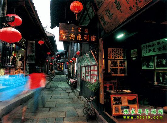 拾級而上,山路一般的陡峭。從碼頭開始綿亙而上的石階,那是一條長達(dá)五里貫穿古鎮(zhèn)的青石板路,它沒有名字,于是人們就直接管它叫五里長街。踏上古街,似乎踩在被悠長歲月遺落的碎片上面。不知不覺走到掛有“土家觀瀑吊腳樓”牌匾的民俗博物館前,從手搖腳踏的棉花機(jī)、閹豬鳴號的羊角到世代相傳的雕花牙床,近百件散發(fā)著鄉(xiāng)土氣息的民間用具,展示著土家族古老豐富的歷史。看護(hù)人說,這是一位土家族年輕人爬山涉水收集來的,靜靜地訴說著這個(gè)小村古老的過去。這棟三層的小樓,一半落在河岸上,另一半?yún)s是由水泥柱支撐著,水泥柱直插河底,任水流日日夜夜地沖刷,小小的吊腳樓仍穩(wěn)穩(wěn)當(dāng)當(dāng)站在那里,任憑時(shí)間的流逝。好聰明的土家人,巧借一片水面,竟建起了如此妖嬈的住房。