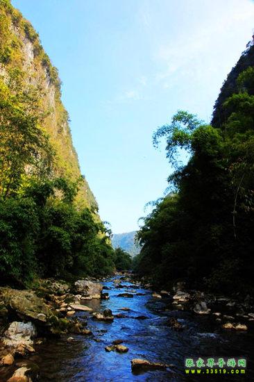 皮渡河沿岸修竹蒼翠,形成翠綠色的長廊,河水清澈透亮,象一條綠色鍛子串起無數明珠。峽谷中水與山親吻,形成靈動的水韻與雄渾的山巒,構成一幅山水長卷