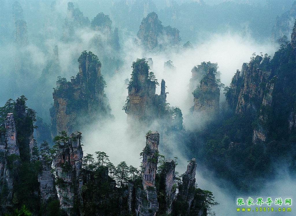 在“后花園”的對面,是一座巍峨的山巒,山上古木參天,遮天蔽日。森林中常有野山羊出沒,夜深人靜之際,常能聽到野羊羔“咩洋”地叫聲,因此被稱作“羊寨”。民國時期,此地曾為土匪占領(lǐng),直到現(xiàn)地,山上還殘留有卡門、暗堡、斷壕、屋場、水井、碓臼、磨坊等殘跡。粗大的松樹上還留有土匪當(dāng)年留下的“V”字型標(biāo)志。站在“山寨”上,舉目眺望,可看見金鞭溪全景,只見一條美麗的溪水從數(shù)百座石林中緩緩穿過,顯得是那樣的幽靜、和諧。從“后花園”向前步行約100米,便是袁家界又一處絕世奇觀——迷魂臺,走上迷魂臺,只見上百座山巒拔地而起,峰涌而至,它們姿態(tài)萬千、氣勢非凡;有的似“天狗望月”,有的像“海螺出水”;有的像“將軍列隊”,有的如“一柱擎天”。幾道山坳和屏障將這些山巒有序的分開,使這些石峰更顯得層次分明,井然有序,在萬道霞光的點綴下,顯得蔚為壯觀,不同凡響。這更像是一幅畫家筆下的水墨丹青,“迷魂臺”攬勝,真宛如仙境神游啊。