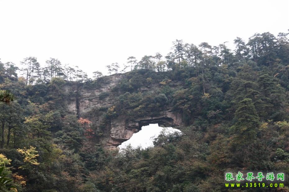 回音谷南向千米處,有一面綠叢如幔橫掛天宇的斜坡,坡上部一孔呈半月形洞開(kāi),似橋拱,長(zhǎng)約40米,高20余米。拱上有一道約200米長(zhǎng)的石梁形成橋面。此橋凌空飛架,兩端微翹,頂面寬4米,長(zhǎng)滿青松灌木。登橋賞景,清風(fēng)拂面,薄霧繞膝,碧天遼闊,橋下幽谷中七八座青峰如小樹(shù)靜立足下,環(huán)顧四周,山巒奔踴,群峰翻騰。橋之西端巖峰凌空突出十幾米,似啄向天空的鷹嘴,鷹頭滿布常青灌木,如鷹毛茸茸。鷹顎頷為灰白色巖體。鷹之嘴尖上長(zhǎng)一古松,飛出十多盤(pán)青枝。登鷹嘴撫松極目,山色盡覽。