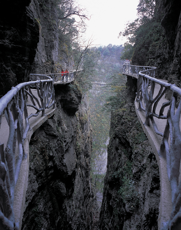 鬼谷棧道,位于覓仙奇境景區(qū),因懸于鬼谷洞上側的峭壁沿線而得名。棧道全長1600米,平均海拔為1400米,整條棧道既不在懸崖之巔,也不在懸崖之側,而是全線都立于萬丈懸崖的中間,給人以與懸崖共起伏同屈伸的感覺。站在棧道之上,腳下是成群的飛鳥,眼前是遼闊的山野,天地任我行的豪情和源自心底的戰(zhàn)栗相互交織,融匯出一種終生難忘的懸崖終極體驗。據施工人員介紹,此條棧道是他們所修棧道中施工最難,最險峻的一條,并且,在棧道的海拔最高點還有一個凌空伸出的長約5米的玻璃站臺和懸于萬丈深淵之上的峽谷吊橋,全面挑戰(zhàn)每個人的“敢”覺!這里,沒有鋼筋水泥的阻礙,只有赤裸裸的透明迎接著每個人的尖叫!