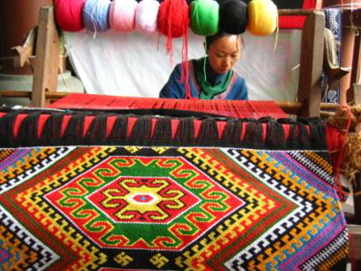 土家織錦是土家婦女用一種古老的木腰機,以棉紗為經(jīng),對五彩絲線或棉線(當今也有用毛線的) 為緯,完全用手工織成的手工藝術(shù)品。