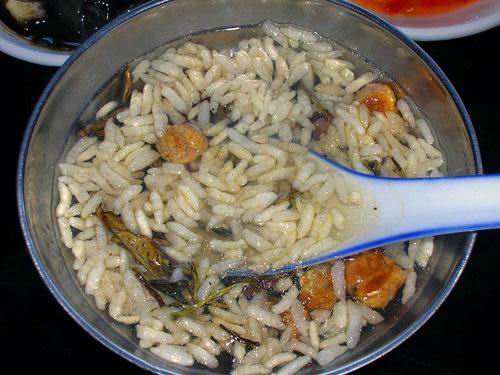 油茶湯可以單獨喝,也可以配上各式輔料喝。據(jù)說最講究的油茶湯輔料有好幾十種。不過,一般人家常吃的也就幾種:炒米、鍋巴、花生米、核桃仁、葵花籽等等。傳統(tǒng)的喝法是不用勺或筷子,端著碗轉著圈喝,講究把湯和輔料同時喝完,或是拿一根筷子插在碗里慢慢劃圈,同時喝湯。要想同時把湯和輔湯都喝干凈也需要一點技術,用土家人的話說就是“舌頭上要長鉤鉤”。在土家山寨有些老人喝油茶湯時嘴還不用接觸到碗,只在碗邊上空用巧勁一吸,碗中之物便進入口中,其中趣味,妙不可言。