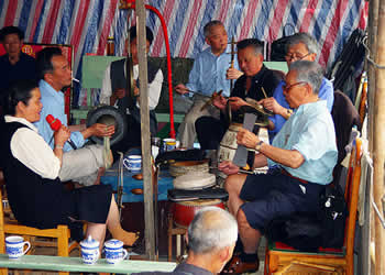 圍鼓(含嗩吶)。又稱打鎦子、打排鼓,是民間紅白會(huì)中不可缺少的樂器。一般7人演奏,樂器有一鼓、一大鑼、一公鑼、兩副鈸、兩嗩吶。其詞曲紅白會(huì)通用,以鼓和嗩吶上系紅、白布為分別標(biāo)記(結(jié)婚不打“四字鈸”曲)。史傳的圍鼓詞有《撩子》、《火鋪》等,《撩子》分《一二三》、《閃翅》、《堆羅漢》、《反落花》等十章,《火鋪》也分《三槍》、《四進(jìn)門》、《八哥洗澡》、《蓮魚吐絲》等十章,嗩吶詞有《八十正宮》調(diào)等。在農(nóng)村,圍鼓是最普及的樂器,每逢紅白喜事都有圍鼓和嗩吶表演。