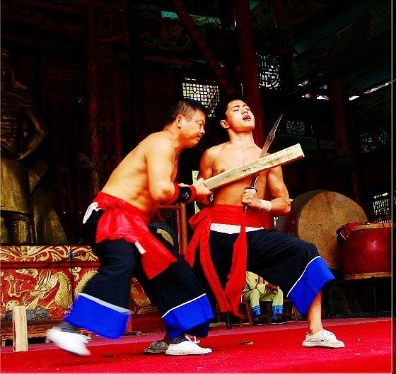 大庸氣,堪稱武林奇葩,曾為祖國贏得聲譽,海內(nèi)外享有極主名望。 大庸氣功是大庸各民族特別是土家族傳統(tǒng)體育項 目之了,分健體氣派、武術(shù)氣功兩類。前者有“返還 功”、“馬王推氣功”、“少林達摩醫(yī)療保健氣功” 等;后者有靜坐、壁虎、靈子、二指彈、碎石、松靜 、硬氣、五禽、五陽功等,尤以硬氣功著稱。大庸硬 氣功,歷史悠久,漢代相單程,明代覃后,清代劉明 燈,當代湯子模、周鐵鞭、杜心武、趙繼書等都具有 超人硬氣武功。大庸土著民族在漫長的反征服、反壓 迫斗爭,博采武當、少林南北派、昆侖派眾家武林精 華,創(chuàng)造出獨此一家的大庸硬氣功。 據(jù)傳,大庸硬氣功鼻祖是楚國鬼谷子?!队蓝h 志》有關(guān)鬼谷子隱居天門山鬼谷洞潛心學(xué)《易》、傳 授方術(shù)的記載。到清代有武林高手朱茂嶺,隱居三岔 村北芭蕉灣洞,研究鬼谷氣功之術(shù),后收西溪坪胡口 子、余世萬(即“余通人”)為徙,傳其衣缽。余通 人將武術(shù)氣功系統(tǒng)整理,發(fā)揚光大,播名于世。 新中國成立后,黨和政府十分重視民間氣功發(fā)掘 整理,并正式列為體育項目加以普及發(fā)展,今日大庸 市習(xí)練硬氣功達數(shù)萬人眾。永定區(qū)官黎坪村世有“硬 氣功之鄉(xiāng)”盛譽,該村男女老幼,練功已蔚成風(fēng)氣, 其武師趙繼書,1979年先后參加全省和全國武術(shù)大賽 ,均獲一等獎,受到國家體委重視,同年7 月趙繼書 專程到北京給中央領(lǐng)導(dǎo)同志匯報表演。嗣后,隨同中 國武術(shù)代表團和國家領(lǐng)導(dǎo)人先后兩次出國,到盧森堡 、意大利、比利時、羅馬尼亞、馬其他和東南亞等國 家訪問。他表演的臥刀碎石、頭頂開石、雙鳳灌耳、 頭碰石柱、叉尖推磨等精彩節(jié)目,博得外國友人好評 。盧森堡一位榮獲國家獎牌的武士,看了表演后連夜 來到中國大使館,將自己珍藏多年的獎牌贈送給他; 盧森堡國王主動熱情走上臺與趙繼書熱情擁抱,連連 稱贊:“了不起!了不起!國際氣功大師!”并把珍 藏紀念章一枚贈送給趙繼書。一位法國朋友十分贊賞 說:“中國的氣功,稱為全人類的寶貴財富,是有科 學(xué)道理的。”自此,大庸硬氣功譽滿全球。湖南瀟湘 電影制片廠專門拍攝了彩色紀錄片《大庸氣功》。 大庸硬氣功共有二十多個項目,最有影響的是: 腹臥鋼叉 由二人在地面扶住一根叉尖朝上的三 股鋼叉,叉尖猁鋒利,然后一個俯身叉尖,尖抵腹部 ,待其四肢平展懸空,扶叉二人轉(zhuǎn)動鋼叉,謂之推磨 。表演時,要求臥叉者運氣于腹,氣意集中,稍有大 意,叉即穿腹而過。 臥刀破石 先固定兩把大刀,刀口朝上,臥刀者 運氣后,由其他人抬臥于刀口上(有仰臥、俯臥兩種) ,然后在臥刀者腹部或背部置一碩大石條(約數(shù)百斤) ,一人或兩人輪大鐵錘狠擊石條直至斷裂破碎為止。 釘?shù)洞财剖?地上倒一層碎玻璃片,一人仰臥其 上;然后腹上置釘床,又一人仰臥釘床上,再于第二 人腹上置釘床,第三人仰臥刀床上,腹部上壓一塊數(shù) 百斤大條石,由人掄錘狠砸,至石破為止。 銀槍刺喉 用一根兩頭安有鋒利槍頭的鋼槍,抵 置兩位表演者喉部,然后相對發(fā)力,至槍桿抵成彎弓 形而喉部安然無恙。 徙手斷石 表演者將堅滑如鐵一塊卵石置于石凳 (地)上,然后運氣于掌或指擊斷(碎)卵石。 踢腿斬石 表演者運氣于腿,以腿踢斷石條。一 般可踢斷15公分以上厚度的麻石條或青石條。 胸部打刀 將鋒利大刀刃口置于胸部肌肉上,用 一根拳頭粗木棒猛擊刀背,至棒斷而胸部無傷。 新中國成立以來,大庸民間武術(shù)與民族體育逐漸 融為一體,發(fā)揮著提高人民身體素質(zhì)、弘揚中華武術(shù) 傳統(tǒng)和增進國際友誼重大作用。除硬氣功外,還有數(shù) 十種武術(shù)形式散見于民間武術(shù)體育活動之中。如打飛 棒、扭扁擔、抵搭斗杠、擠油渣、甩抱腰、舉石鎖、 板牛角(一種斗牛形式)等等。其特點是因地制宜, 不分場地,凡田園地角院壩集鎮(zhèn),都是習(xí)武練功、開 展活動的處所,頗具泥土氣息。擬或以生活中某些動 作和動物的某種形態(tài),稍加模仿演繹,便成某一獨特 武術(shù)形式。如天門武術(shù)功夫大師余道人所創(chuàng)造的“宮 天梳”、“巖燕樸天門”等;也有就地理特點創(chuàng)造某 種武功形式的,如“蕩藤”等。