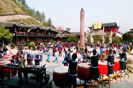 擺手舞是土家族最有影響的大型舞蹈,帶有濃烈 的祭祀色彩。歌隨舞而生,舞隨歌得名。擺手舞產(chǎn)生 于遠(yuǎn)古時(shí)代,明清時(shí)期尤其盛行。清雍正《永順府志》 載:“每歲正月初三至十七日,男女齊集,鳴鑼擊鼓, 跳舞唱歌,名曰擺手”。 擺手舞又名“社巴”。整個(gè)活動(dòng)民祭曲舞蹈、唱 歌等為表演形式,以講述人類起源、民族遷徙、英雄 事跡為內(nèi)容。祭祀儀式畢,由“梯瑪”或掌壇師帶領(lǐng) 眾人,進(jìn)擺手堂或擺手坪跳擺手舞,唱擺手歌?!逗?漢書》稱擺手舞為《巴渝擺》;《晉書·樂志》認(rèn)為 舞曲四篇中就有“予渝”、“弩渝”是離不開武器的 ,故為一種古代戰(zhàn)舞。土人作戰(zhàn)前跳此舞以助長(zhǎng)士氣 。 擺手舞分單擺、雙擺、大擺手、小擺手?jǐn)?shù)種。跳 擺手舞擊大鼓、鳴大鑼、氣勢(shì)宏渾壯闊,動(dòng)人心魂。 舞蹈時(shí)手腳呈同邊動(dòng)作,踢踏擺手,翩躚進(jìn)退,成雙 成對(duì),意境生動(dòng)。 擺手舞不僅是民間一種娛樂和健身性質(zhì)的體育活 動(dòng),亦是舞臺(tái)上獨(dú)樹一幟的藝術(shù)奇葩,正是:“擺手 堂前艷會(huì)多,攜手聯(lián)袂緩行歌。鼓鑼聲雜喃喃語(yǔ),裊 裊余音嗬囈嗬。”