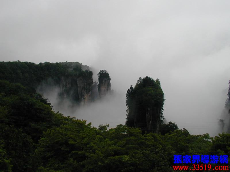 這里,我還給大家講個奇異現(xiàn)象。1991年4月的一天下午,雨過天晴,整個天子山漫開一片朦朦朧朧的薄霧,從西海到神堂灣一帶,一座座巖峰在霧中時隱時現(xiàn)。一群上海游客來到點將臺,忽然,一幅奇異的場景把大家驚呆了:神堂灣中央,七位少女從云霧中飄落到一座巖峰峰頂?shù)钠脚_上,飲茶、撫琴,翩翩起舞達40分鐘之久。游客們起初以為是一種幻覺,揉揉眼睛再看,仍然是三綠四紅,長發(fā)披肩,體態(tài)婀娜,舞步輕盈。直到“仙女們”隨一片云霧漸漸隱去的前一秒鐘,大家仍然不敢弄出半點聲響,有相機的就拼命按快門。遺憾的是距離太遠了,當晚將膠卷取去沖洗,什么也沒留下。消息傳開后,有人相信,有人不相信。其實,神話也好,事實也好。這種奇異現(xiàn)象完全可用科學(xué)去解釋。“海市蜃樓”這是人所共知的;而大沙漠中不也經(jīng)常出現(xiàn)綠洲、村莊、城市么?