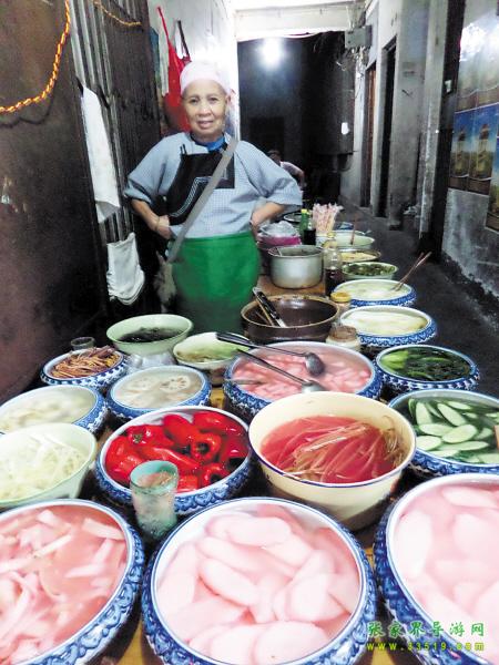 鳳凰本地人介紹好吃的,總是推薦姜糖、獼猴桃等,事實上,當(dāng)?shù)匦∠锷钐幍呐莶送瑯恿畈簧儆慰唾澆唤^口。酸酸的泡菜可以是豆角,也可以是當(dāng)?shù)靥赜?的紅心蘿卜、刀豆、包菜、涼薯等,這些都可以成為泡菜原料,每種原料用陶缽盛著擺在架子上。想吃什么,自己用筷子夾了放一起。過完秤,可以根據(jù)自己的喜好 放辣椒粉或白糖拌(辣椒粉還分微辣、猛辣),往旁邊小桌上坐下,邊吃邊看著古街上那些匆匆而過的游客,那種感受絕不亞于在國外街頭喝咖啡賞景。