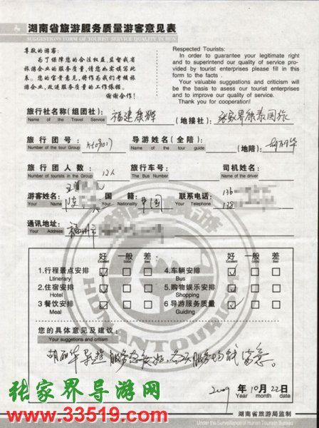 2009年10月17日福州王先生一行12人接待質(zhì)量反饋單: