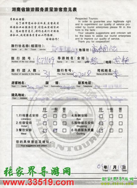 2009年11月9日馬來(lái)西亞yeap先生一行31人旅游接待質(zhì)量反饋單: