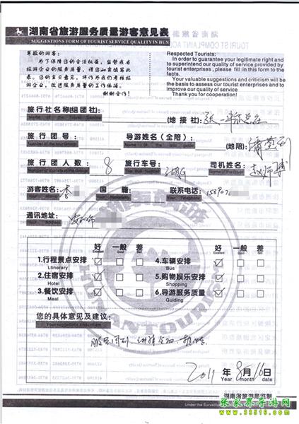 2011年8月16日李小姐旅游質(zhì)量反饋:服務(wù)周到,講解全面,熱情